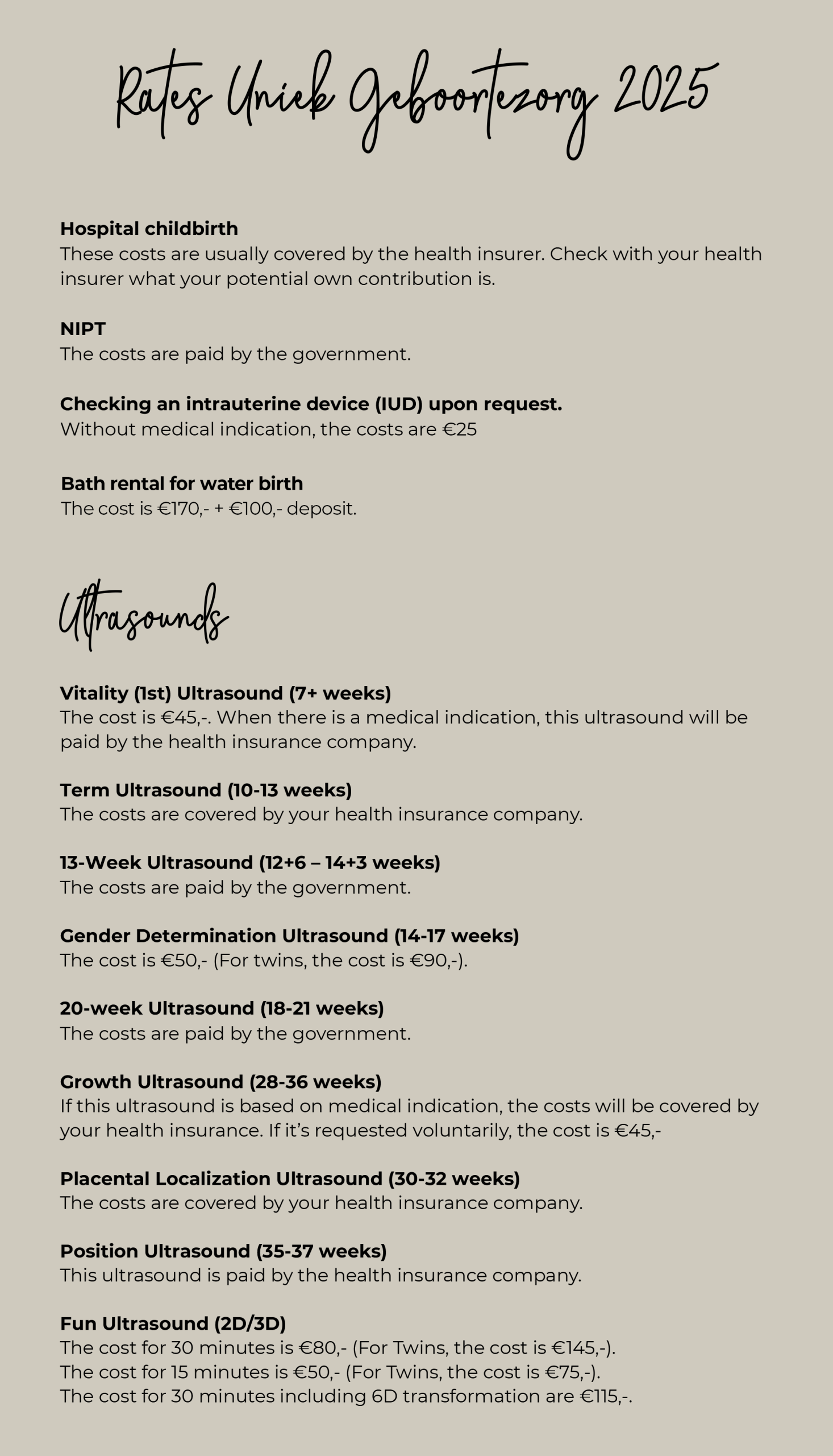 The costs for midwifery care are covered by the (basic) health insurance. If you are not insured, we will invoice you for the costs.